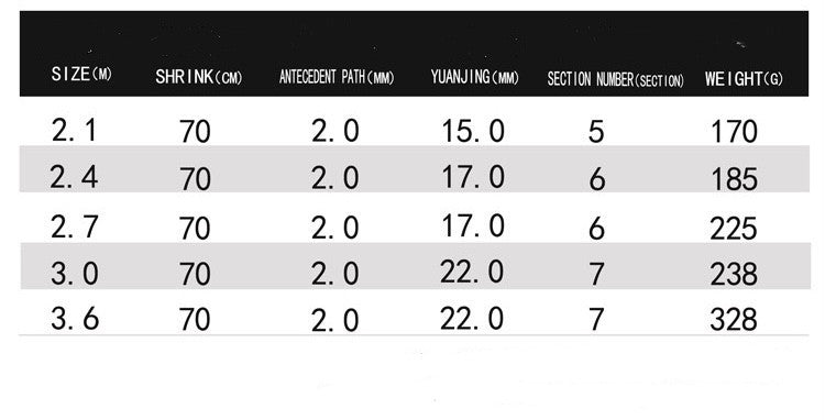 Product information: Size: 2.1M 2.4M 2.7M 3.0M 3.6M Category: telescopic fishing rod Top diameter: 1.9MM Guide ring: metal Material: carbon Package: Fishing rod X1